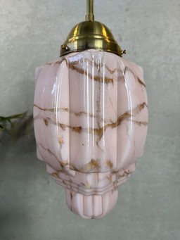 Lampada a sospensione antica Art Déco con vetro marmorizzato rosa chiaro (lampada da soffitto)