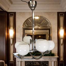 Lampadario antico in stile Art Déco cromato con sfere di vetro, 1920Lampadario antico in stile Art Déco cromato con sfere di vetro, 1920