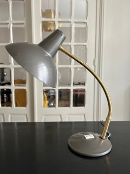 Lampada da tavolo/scrivania vintage in stile pianoforte industriale degli anni '70, grigia con collo d'oca cromato - Des