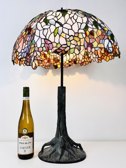 Lampada da tavolo Tiffany molto grande con base a tronco d'albero e paralume a forma di fiore.