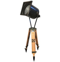 Faretto da teatro vintage nero su treppiede in legno, anni '60