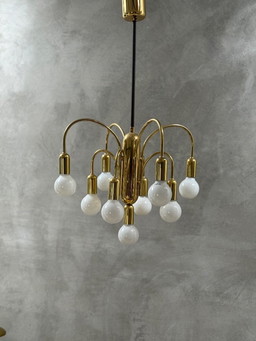 Rarissimo splendido lampadario a 12 bracci in ottone del Mid Century con paralumi in vetro opalino