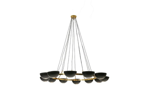 Lampadario a 12 luci in ottone patinato e metallo laccato nero. Contemporaneo