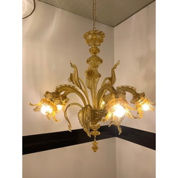Lampadario in vetro di Murano ambrato con fiori e foglieLampadario in vetro di Murano ambrato con fiori e foglie