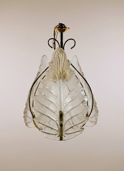 Lampadario in vetro di Murano iridescente e foglie di palma in ottone