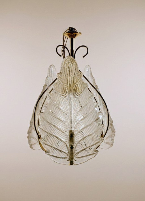 Lampadario in vetro di Murano iridescente e foglie di palma in ottoneLampadario in vetro di Murano iridescente e foglie di palma in ottone