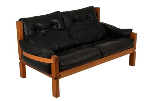 Pierre Chapo. Divano a due posti S22 in olmo e pelle nera. 1970