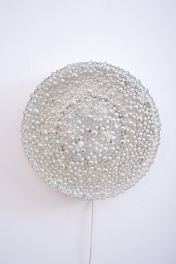 Lampada da parete cromata originale Staff Motoko Ishii degli anni '70 con sfere di vetro bianco perlato scintillante