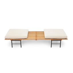 Panca con doghe in legno e cuscini, anni '60