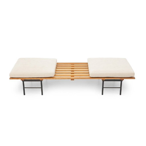 Panca con doghe in legno e cuscini, anni '60Panca con doghe in legno e cuscini, anni '60