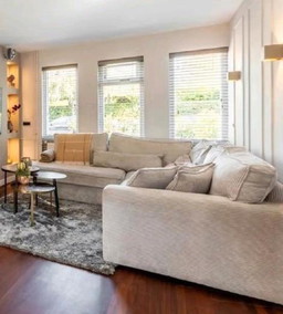 Ampio divano angolare in velluto a coste di colore chiaro