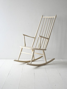 Sedia a dondolo scandinava vintage in legno laccato bianco