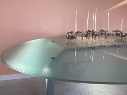 Tavolo da pranzo in vetro verde/blu, design italiano.