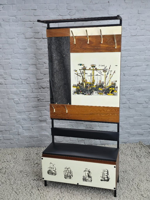 Mid-Century Design Wooden Coat Rack with Mirror and Storage Bench, Pastoe Style, Netherlands, 1960sMid-Century Design Wooden Coat Rack with Mirror and Storage Bench, Pastoe Style, Netherlands, 1960s