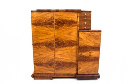 Specchio a figura intera, cassettiera a specchio con anta scorrevole in vetro in betulla fiammata, anni '50, restaurata