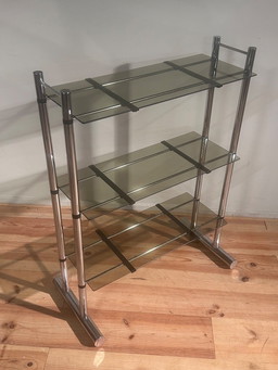 Scaffale anni Settanta in cromo con vetro fuméScaffale anni Settanta in cromo con vetro fumé