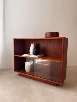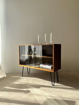 Vetrina anni '60 in noce impiallacciato con ante scorrevoli in vetro