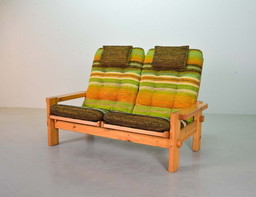Yngve Ekstrom Mid-Century Scandinavian Design 2-Seat ‘Dymling’ Sofa in Pinewood and Rainbow Fabric for Swedese. Sweden, 1970s.