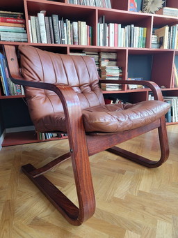 Poltrona vintage in pelle cognac e palissandroPoltrona vintage in pelle cognac e palissandro