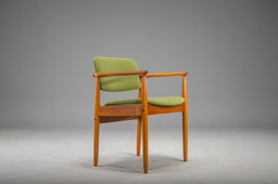 Poltrona danese degli anni '60, velluto verde da arredamento, legno di quercia intagliato.