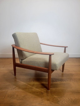 Poltrona danese, anni '70, legno di teak, tessuto di lana per mobili.