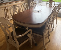 Robusto tavolo da pranzo in legno massello con 6 sedie abbinate.