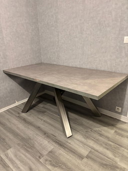 Piano del tavolo in legno grezzo canadese, fissato su una struttura in acciaioPiano del tavolo in legno grezzo canadese, fissato su una struttura in acciaio