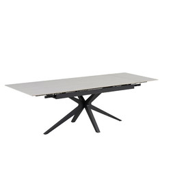 TAVOLO DA PRANZO ALLUNGABILE TONIA, BASE IN METALLO NERO, PIANO IN CERAMICA TRAVERTINO BIANCO, 160/240x90x76cm