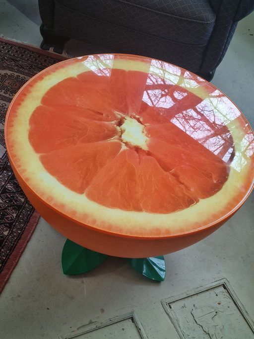Tavolo vintage arancione con piano in vetro e gambe in metallo, Mid Century, SpaceageTavolo vintage arancione con piano in vetro e gambe in metallo, Mid Century, Spaceage