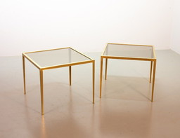 Elegant Hollywood Regency Minimalistic Solid Brass Side Tables with Smokey Glass Top by Vereinigte Werkstätten. Set of 2. 1970s.Elegant Hollywood Regency Minimalistic Solid Brass Side Tables with Smokey Glass Top by Vereinigte Werkstätten. Set of 2. 1970s.