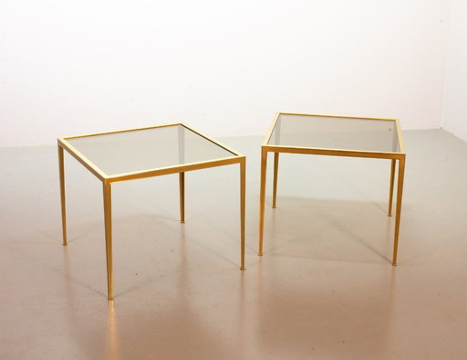Elegant Hollywood Regency Minimalistic Solid Brass Side Tables with Smokey Glass Top by Vereinigte Werkstätten. Set of 2. 1970s.