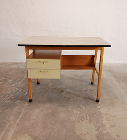 Scrivania vintage di piccole dimensioni, in legno e laminato.