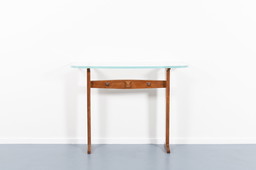 Tavolo consolle minimalista curvilineo in acciaio inossidabile, ottone e vetro