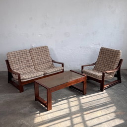 Salotto vintage con tavolino da caffè e motivo scozzese ungherese, anni '70Salotto vintage con tavolino da caffè e motivo scozzese ungherese, anni '70