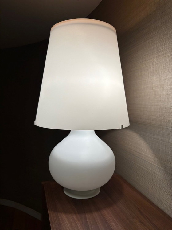 Bellissima lampada da tavolo modello "1853". Questa icona del design è realizzata in vetro soffiato satinato bianco. Questa lampada da tavolo ha una doppia sorgente luminosa, sia alla base che nel paralume e nell'anello superiore. Altezza: 78 cm.