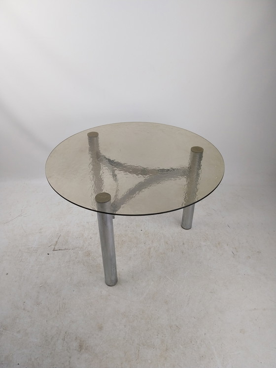 Tavolino da caffè degli anni '60 proveniente dalla Repubblica Ceca. Cromato con piano in vetro fumé. In ottime condizioni originali d'epoca. Diametro 80 cm, altezza 50 cm.