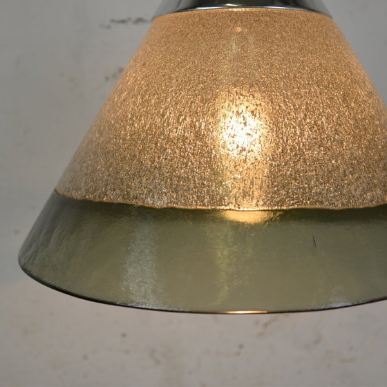 Questa lampada a sospensione Conus di Peil & Putzler degli anni '70 è un bellissimo esempio di vetro soffiato a mano. La lampada combina una tonalità grigio-verde con una finitura cromata, creando un look elegante e senza tempo. Perfetta per gli amanti del design vintage che cercano un'aggiunta unica al proprio arredamento.