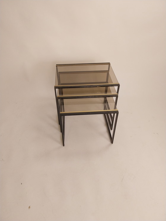 Questo bellissimo set di mimi anni '70 di Belgo chrom è un elegante esempio di design vintage. Il set è composto da tre tavolini con un'elegante struttura in metallo nero e oro e piani in vetro fumé. Perfetti per gli interni retrò, questi tavolini offrono funzionalità e fascino estetico. I tavolini possono essere facilmente accostati per risparmiare spazio. Dimensioni: gr. 50 x 39 x 40cm mi. 45 x 39 x 38cm kl. 40 x 39 x 35cm