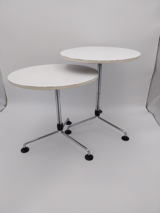 Questo set di 2 tavoli Brabantia degli anni '60 è un bellissimo esempio di design moderno del Mid Century. I tavoli hanno un design elegante e funzionale con piano in legno bianco e gambe in metallo color argento. Ideali come tavolini in salotto o come comodini in camera da letto. Un'aggiunta senza tempo a qualsiasi interno. Grande 34 cm di altezza piccolo 30 cm di altezza 30 cm di diametro.