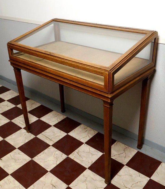 Questa vetrina vintage è realizzata in rovere, riconoscibile per le sue venature distinte e il suo colore caldo e naturale. La struttura in legno è abbinata a pannelli in vetro sui lati e sul piano, che consentono di vedere chiaramente il contenuto. Il mobile ha un design semplice e funzionale con gambe dritte e un piano incernierato che si ripiega per un facile accesso.