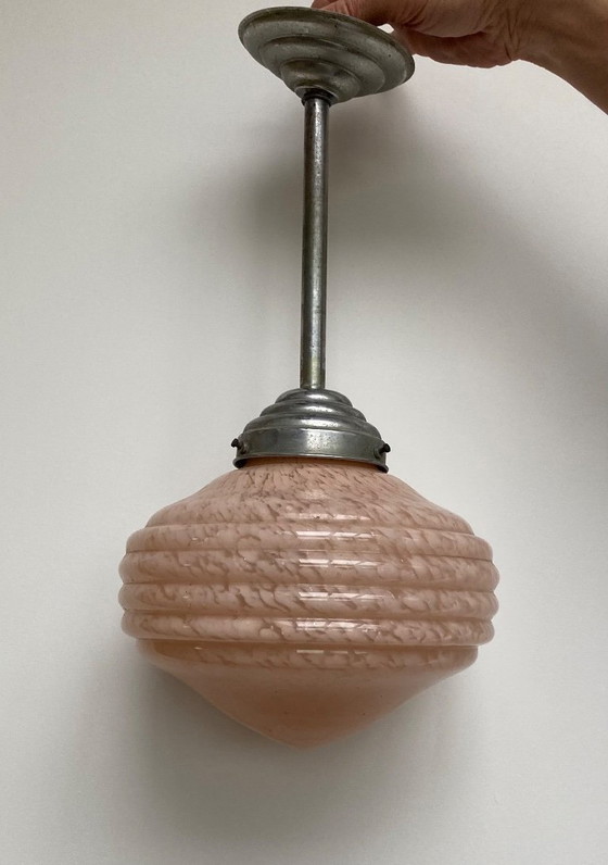 Lampada da soffitto o da ingresso vintage, stile Art Déco. Colore del vetro: rosa salmone marmorizzato. Dimensioni: 40 cm di lunghezza, diametro della sfera di vetro circa 21 cm. Include cavo elettrico nuovo e presa grande.