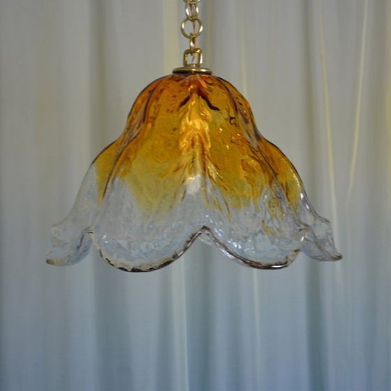 Splendida lampada a sospensione in vetro di Murano a forma di fiore degli anni '60, prodotta da Kaiser Leuchten. La lampada unisce eleganza a un tocco di fascino retrò. Le tonalità arancioni e trasparenti del vetro creano una luce calda e accogliente in ogni ambiente. Perfetta per gli amanti del design vintage.