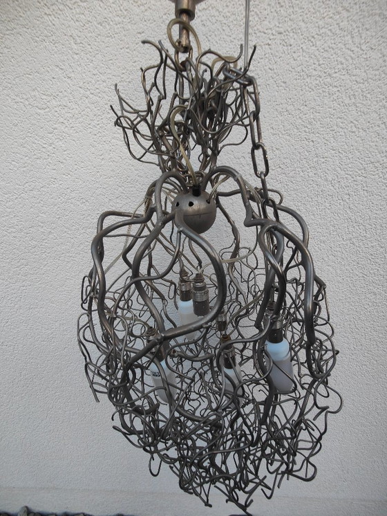 Lampadario Hollywood di BrandvanEgmond. Codice articolo HCC40N, dimensioni Ø40xH.60 cm. Questo lampadario risale ai primi tempi, quando gli artisti Brand & van Egmond li realizzavano ancora in proprio. Il lampadario risale ai primi anni '90. Versioni successive sono state prodotte industrialmente. Il paralume in metallo è nichelato.