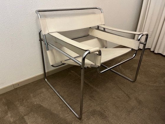 Sedia Wassily realizzata dall'azienda Gavina in pelle bianca, la struttura è in tubolare d'acciaio piegato e cromato, successivamente questa poltrona è stata prodotta da Knoll International.