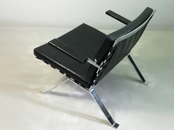 Le staffe dei braccioli sono realizzate in robusto acciaio piatto cromato. I cuscinetti dei braccioli sono in legno e rivestiti in pelle Skai nera (rivestimento originale Girsberger).