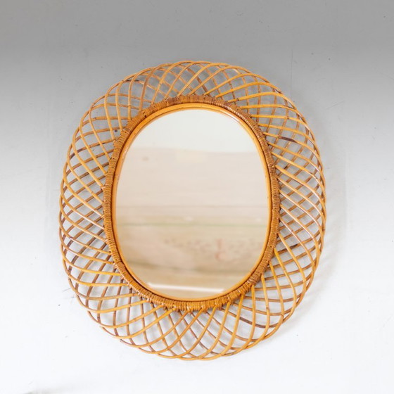 Lo specchio originale è intatto, senza danni o rotture, mentre la cornice in bambù presenta micro segni di ossidazione che ne accentuano il fascino autentico.