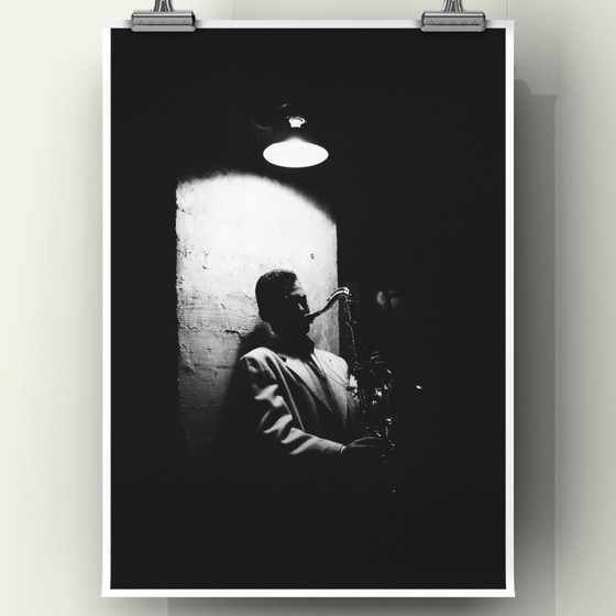 Un ritratto elegante e senza tempo del sassofonista jazz americano Stan Getz, scattato a Hollywood nel 1960 dal leggendario fotografo William Claxton.