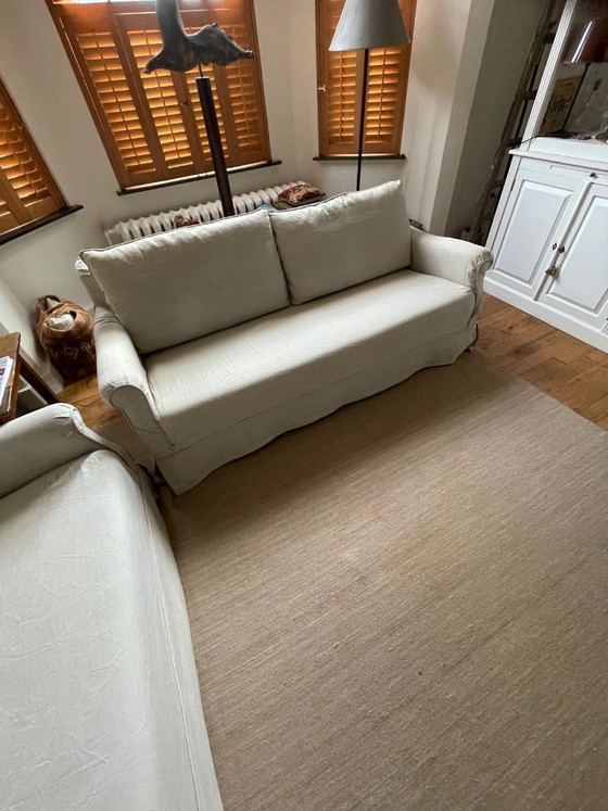 Lo stile di questi splendidi divani è una combinazione di rustico, sobrio e robusto. Hanno un aspetto sobrio e senza tempo e si adattano perfettamente a innumerevoli interni. Inoltre, sono meravigliosamente comodi grazie alla seduta profonda. Abbiamo acquistato i divani nuovi circa 10 anni fa da HerbersLifestyle. Il prezzo di listino era di 1.600 € ciascuno (era un'offerta speciale all'epoca; purtroppo non riusciamo più a trovare la ricevuta). I divani non sono stati usati intensamente e sono quindi ancora in ottime condizioni, con minimi segni di usura (come pieghe). Tutti i rivestimenti sono sfoderabili, il che li rende molto facili da pulire. Il rivestimento del divano a sinistra è stato lavato una sola volta (è stato facile, il tessuto non si è ristretto), l'altro no (per ora). Il tessuto è lino e gli spessi cuscini dello schienale sono imbottiti in piuma. La struttura è in pino e compensato ed è completamente rivestita con un tessuto resistente.