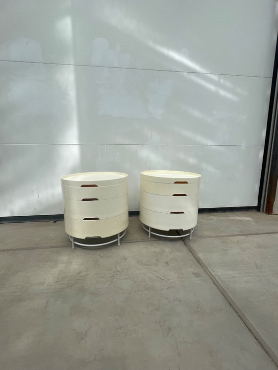 Set di 2 tavolini moderni disegnati da T. Richardson per IKEA. Questi tavolini presentano un design elegante e rotondo con finitura crema, perfetti per interni contemporanei. Realizzati in plastica resistente e metallo, offrono stile e funzionalità. Ideali per l'uso in soggiorno o come comodini. Nota a margine: il colore può variare nel corso degli anni, ma non si rovina.