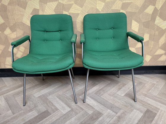 Questo set di due poltrone Artifort Channel, disegnate da Geoffrey Harcourt nel 1980, offre comfort e stile. Le sedie sono rivestite in tessuto verde e hanno una robusta struttura in metallo. Con un'altezza di 84 cm, una larghezza di 60 cm e una profondità di 45 cm, sono ideali per qualsiasi arredamento moderno o vintage. L'altezza della seduta è di 46 cm, per garantire una posizione comoda. Perfetto per gli amanti dell'arredamento di design.